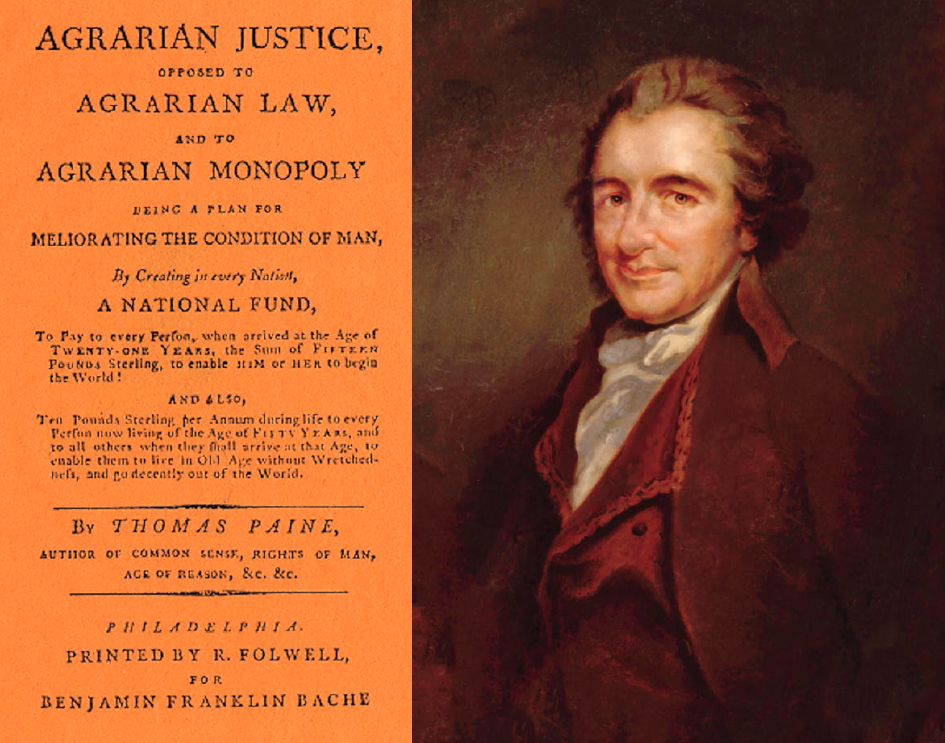 “There are two kinds of property,” Paine wrote. “Firstly, natural property, or that which comes to us from the Creator of the universe—such as the earth, air, water. Secondly, artificial or acquired property—the invention of men.” The latter kind of property must necessarily be distributed unequally, but the first kind rightfully belongs to everyone equally. It is the “legitimate birthright” of every man and woman, “not charity but a right.”