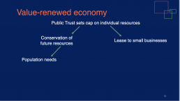 How would a value-renewed, needs-based society manage non-renewable resources? It requires a public trust that makes strategic decisions in coordination with business and government. This is a broad-based group of people who are given the power and authority to manage non-renewable resources in the public interest.