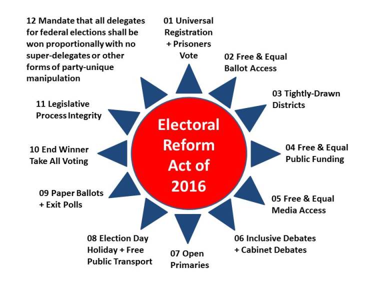 I tried eight times over two years to connect with Bernie Sanders. Note that point twelve would have assured him the nomination and he, not Hillary Clinton, would be facing off against Donald Trump today, at the same time that Gary Johnson and Jill Stein would be viable nominees given the Instant Run-Off reform (point ten) as well as all the others.